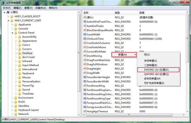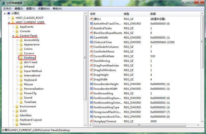 3.打开以下所示的HKEY_CURRENT_USER--Control Panel--Desktop文件夹: