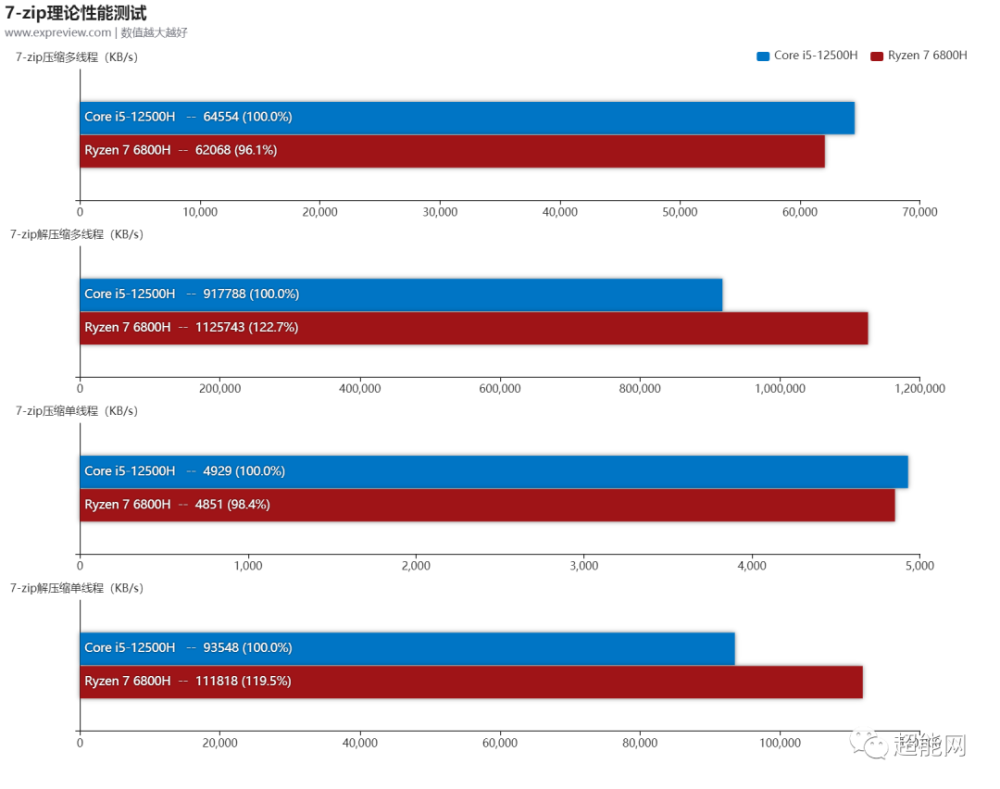 在7zip理论性能测试中,搭载Core i5-12500H的联想ThinkBook 14+酷睿版相对于搭载Ryzen 7 6800H的联想ThinkBook 14+锐龙版各有胜负,压缩 word cool i5-12500H更快,降压速率为7 6800 H 更快.