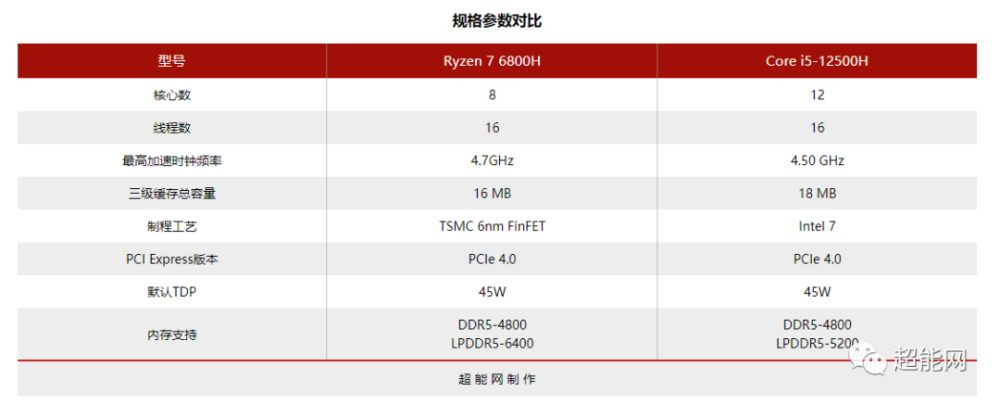 Ryzen 7 6800H和Core i5-12500H的规格如下: