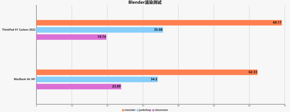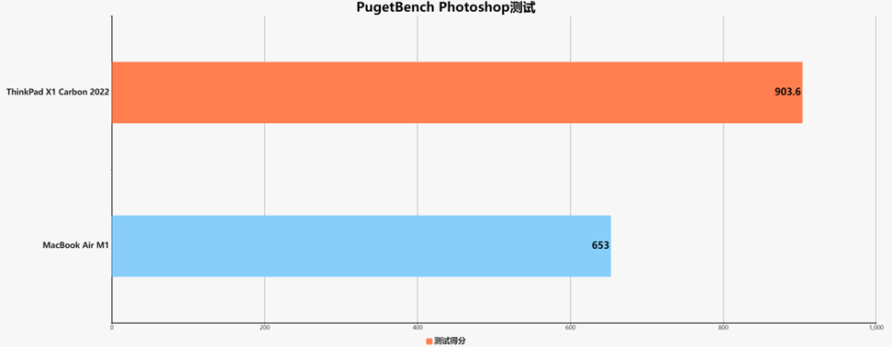 然而,在反映CPU核心图形渲染性能的V-Ray测试中,Cooley i7-1260P的领先率约为34%。Cooley i7-1260P在V-Ray处理器中取得6283,6375,6342分,并进行了三个连续测试。苹果M1芯片的三个连续测试成绩分别是4788、4722和4592。在 Blender测试中,它也反映了图形渲染,二者互有胜负,其中ThinkPad X1 Carbon 2022的monster和junkshop两项略高,MacBook Air M1的教室性能略高于前款。在PugetBenchPhotoshop测试中,反映了图形设计处理能力,ThinkPad X1 Carbon2022也大幅领先。MacBook Air M1在PugetBenchPhotoshop测试中仅获得653分。ThinkPad X1 Carbon 2022测试成绩为903.6。
