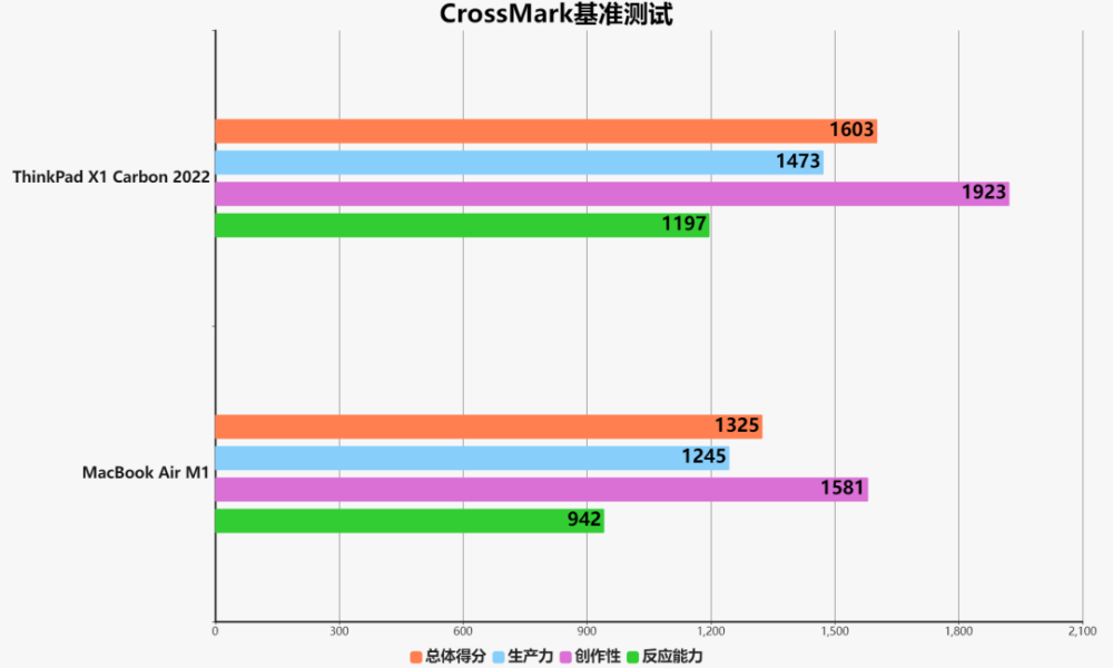 接下来, 看看CrossMark的基准.CrossMark是一个由BAPCo开发的基准测试软件,涵盖创造力 、 生产力和反应速度三个方面,单项还是全部,Coolidge i7-1260P在CrossMark测试中领先整个苹果M1,总共,他领先约21 % 。在单位方面,生产率得分领先18%,创造性得分领先约22%,反应性得分领先27%。