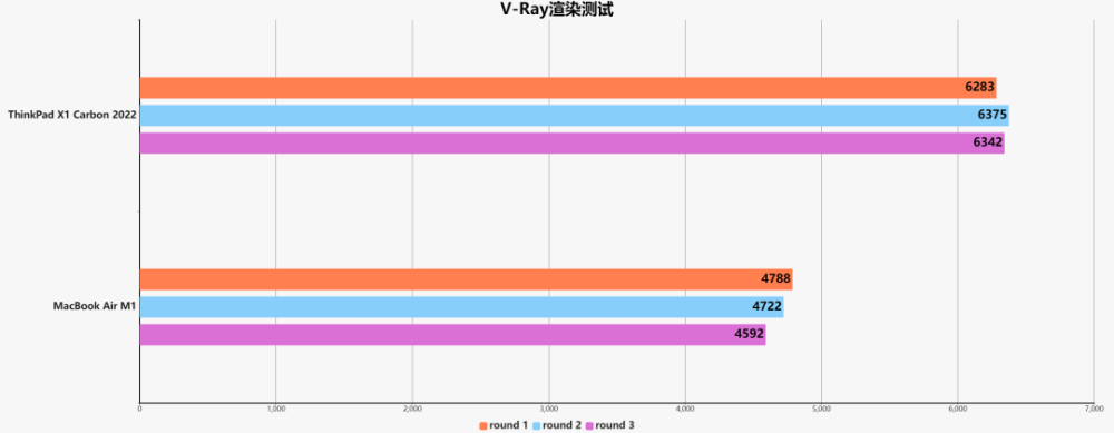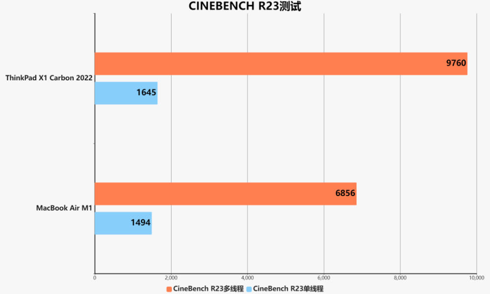 在CINEBENCH R23测试中,ThinkPadX1碳2022单线性能为1645pts,与 MacBookAir M1的1494pts相比,领先10%;在9760pts的ThinkPadX1碳2022上多核心性能,它领先MacBook Air M1的685.6pts,约42%。不难看出, ThinkPad X1 Carbon 2022上的这枚酷睿i7-1260P,凭借更高的主频,R23在单螺纹测试方面略有领先;在多螺纹性能性能方面,Cooley i7-1260P和Apple M1,两个核心的平均算力几乎是等的。但由于比苹果M1核数的一半多,Cooley i7-1260P最终在计算方面取得了显著的领先。