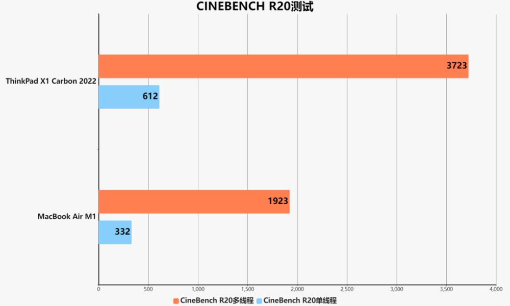 目前,MacBook Air M1支持的性能测试软件不多,例如,经典的CINEBENCH测试,另外,只有直通的CINEBENCH R23,CINEBENCH R20的旧版本只支持Rosetta 2的翻译。因此我们会看到,在CINEBENCH R20测试中,ThinkPad X1 Carbon 2022 和 cooler i7-1260P 几乎全都滚动了。单行成绩为612cb,多线性性能为3723cb,当然这并不是i7-1260P处理器最大的潜力。罗塞塔2翻译R20测试后,让MacBookAir上的M1芯片也有不小的性能损失,最后的单行成绩是332cb,多线性分数是1923年。