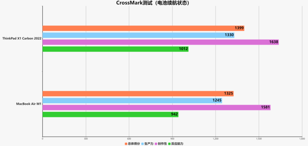 并模拟实际用户日常使用,我们还对两个没有电源的笔记本进行了交叉点基线测试。同样的光辉,我们打算推出ThinkPadX1碳2022性能模式。当模拟电池连续运行时,Cooley i7-1260P也完全领先于CrossMark测试。可以看出,在未插件状态下,苹果的M1芯片在电池寿命中,性能和功率消耗几乎相同;i7-1260P的性能输出调制策略有点保守。