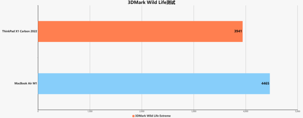 看过处理器性能比较,让我们看看两者之间的图形性能上的差异。ULBenchmark发布了GPU图形性能基准测试工具3DMarkWildLife,最引人注目的特征是它可以跨越平台运行点比较,它支持三种系统: Windows、iOS和Android。在ThinkPadX1碳2022中,3D标记野生动物的得分是14302,3DMark Wild Life Extreme得分3941。Apple mac 也支持原始的3D Mark Wild Life Extreme单一测试,最终MacBook Air M1的Wild Life Extreme分数为4465,主要火炬X核显示约13 % 。