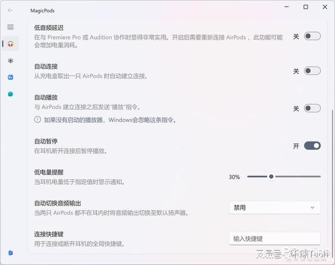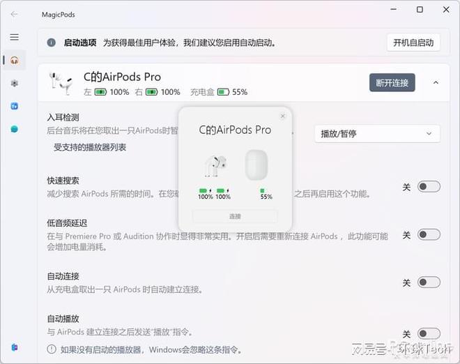 当然,MagicPods可以提供不仅仅是动画。打开MagicPods主界面后,你可以查看iPod的各项功能设置,包括自动连接、自动播放、低频延迟等。虽然功能的丰富性并不比苹果系统好,但总是比以前更好。