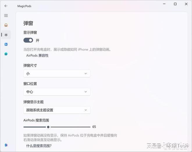 MagicPods显示AirPods pop-up窗口,效果是相当不错的。在App当中,您可以定制 pop-up窗口的风格,包括大小、大小、窗口位置和偶主题。没错,MagicPods支持多种Windows11主题,它可以更好地适应深色模式。