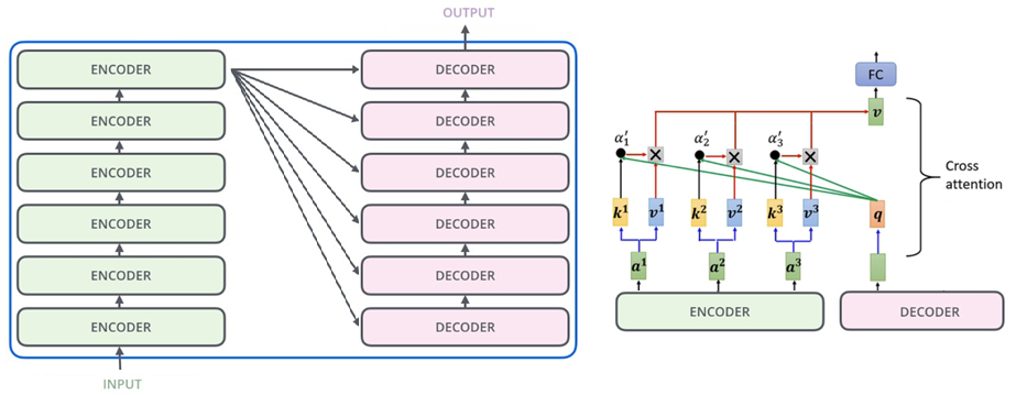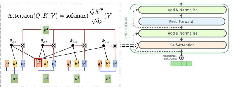 Self-Attention中的Q,K,V也扮演了类似的角色。在矩阵计算中,点积是计算两个矩阵相似性的方法之一。使用Q和K来计算相似性,然后, 根据相似性, 与V进行权重匹配.正确的值是查询和键的相似性。经过Self-Attention层后,输入信息建立彼此之间的联系,这种连接可以通过平行计算(矩阵操作)完成。但是这个矩阵计算了未知的位置信息(没有序列),因此,Transformer对输入进行了位置编码(Positional Encoding),输入的序列位置和顺序信息被一起送入网络,存储输入图像的位置信息和音频的时间信息。Self-Attention的输出会再经过归一化和前馈网络,完成一个编码层的工作,在Transformer中, 多个编码层被层化完成编码工作.建立输入信息之间更紧密的联系.