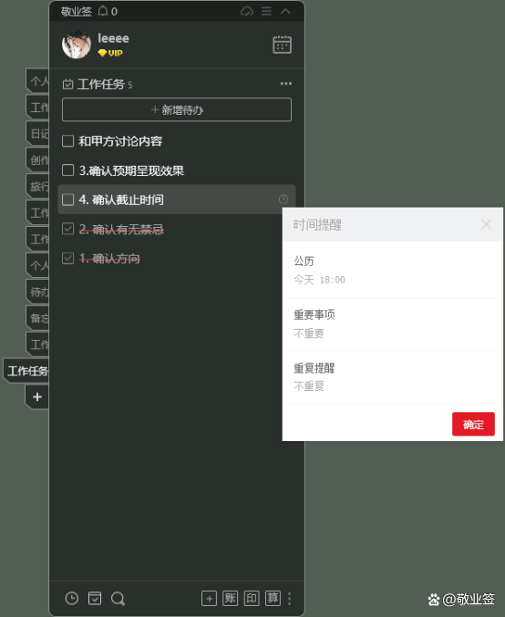 执行的时候,每当任务完成时,将钩到清单上,任务将进入完成状态,如果某些任务因特殊原因延迟,然后你可以在此点设置一个等待提醒,用于一次计划的提醒、重复提醒、重要事项的间隔提醒等。为了唤醒你未来的自我,以防忘记。