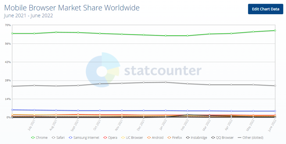 此外,在手机端,谷歌Chrome浏览器占市场份额的68.8%,苹果的Safari浏览器占市场份额的24.09%。三星 Samsung Internet 浏览器以 4.81% 的市场份额排名第三。