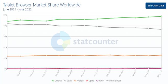 在平板端,谷歌 Chrome 浏览器市场份额虽然仍排名第一,但仅有 48.68%。而苹果 Safari 浏览器市场份额则高达 36.63%,排名第二。这应该是跟苹果 iPad 市场占有率较大有关。