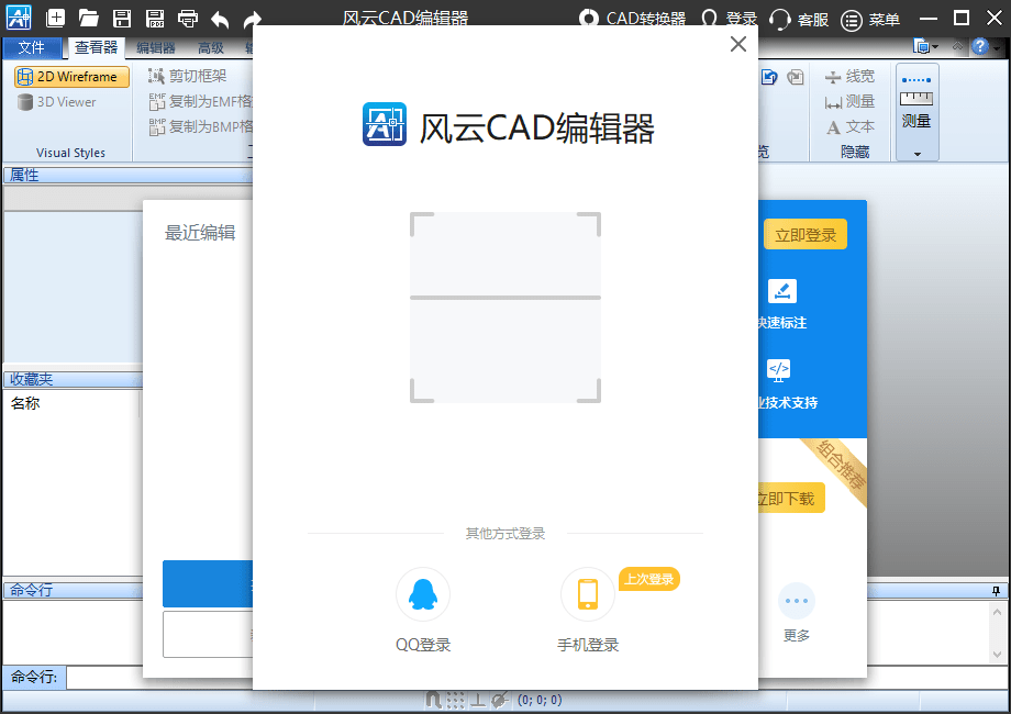 打开安装完成的“风云CAD编辑器”软件,点击“点击登录”、“立即登录”和“登录”按钮进行账号登录(如下图所示)。第一次使用可以用微信、QQ和手机号进行注册登录。