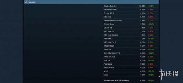 VR 设备方面,Oculus(Meta)Quest 2的份额成功超过了50%,比上月提高了1.3%,成为真正的VR头显一哥。目前,Steam有6.67%的用户拥有VR设备,较上个月上涨了4.8%