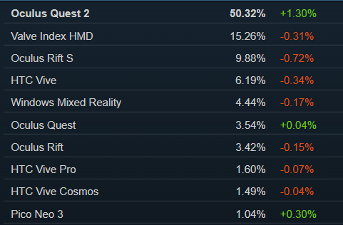在VR设备上,Oculus(Meta)Quest2的市场份额超过50%,比上个月的1%高出3%,成为真正的VR头台。