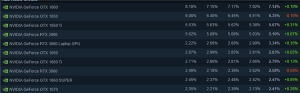 Steam今天更新了7月份的调查报告,NVIDIA继续包揽热门显卡的前十名,而一代神卡GTX 1060也依旧稳居第一,并与第二名GTX 1650有2.1%的差距,称得上是“傲视群雄”。