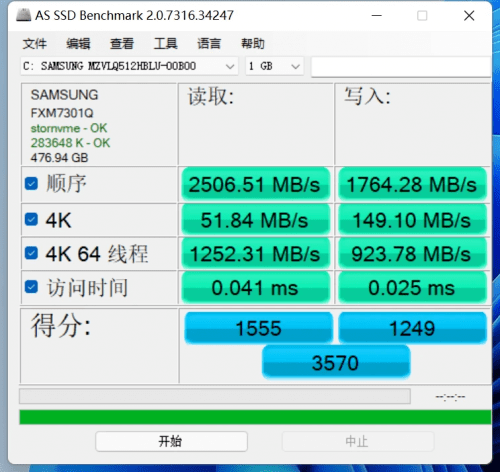硬盘方面,真我笔记本Air搭载三星PM991固态硬盘,测试的版本为512GB容量。在测试结果可以看到,读取2506.51MB/s,写入1764.28MB/s。