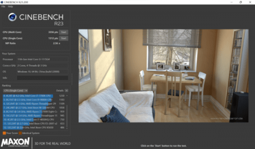 第一个是Cinebench R23,一个基于Cinema4D的测试软件,它为i3-115G4处理器提供了3356pts的多线性分数和1312pts的单线性分数。