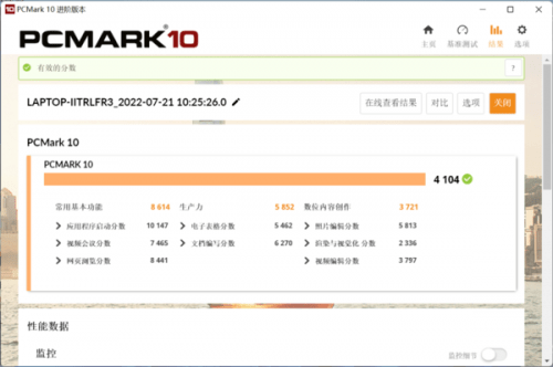 最后,在办公室用户PCMark10测试中,I笔记本电脑Air分为4104、通用基本功能8614、生产力5825、数字内容创建3721。