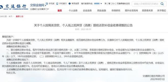 8月1日,银行在其网站上发布公告,题为“个人抵押贷款及个人网上抵押(消费者)预付款补偿费的调整”。