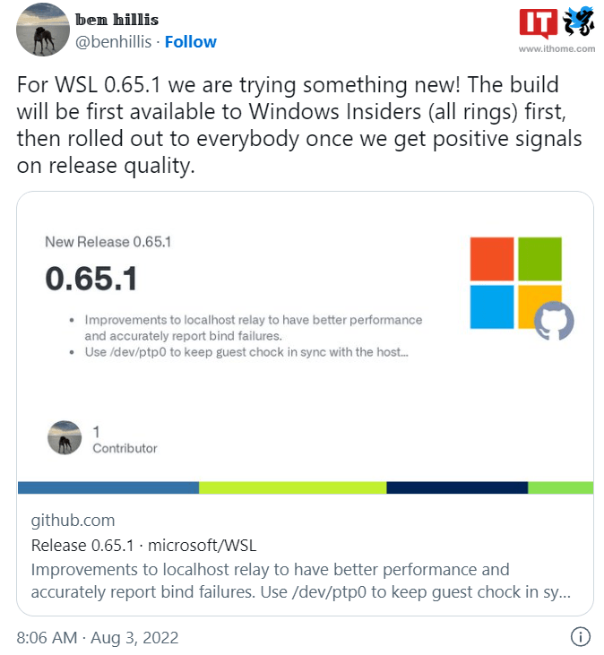 微软WSL项目经理本·希利斯宣布,WSL 0.65.1 已适用于所有 Windows Insider 用户。