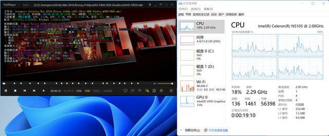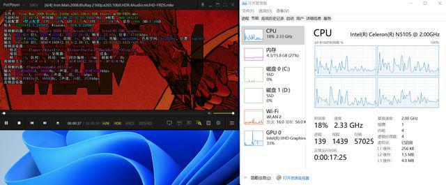 视频解码部分,H265 + 10bit + HDR 4K蓝光视频(胜利联赛决赛,铁人1)可以完美地播放,CPU和GPU的利用水平也维持在相对较低的水平,只要它不是超出日常使用标准的挑战,N5105的硬件和软件解码应该兼容。