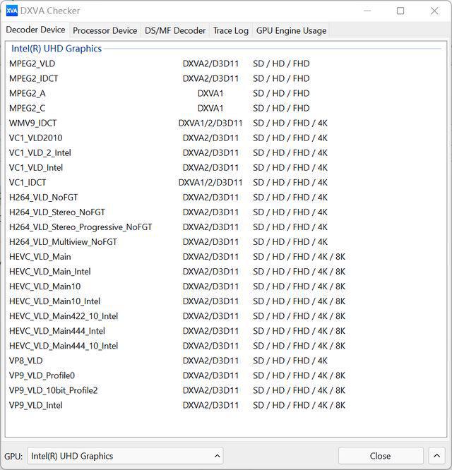 用于初级机器,每日浏览网页,播放视频,办公室软件,它应该应用于相对较高的频率.使用DXVA检查器,你可以看到Intel N5105 UHD内核显示器,它支持一般的视频解码,包括H264和HEVC。