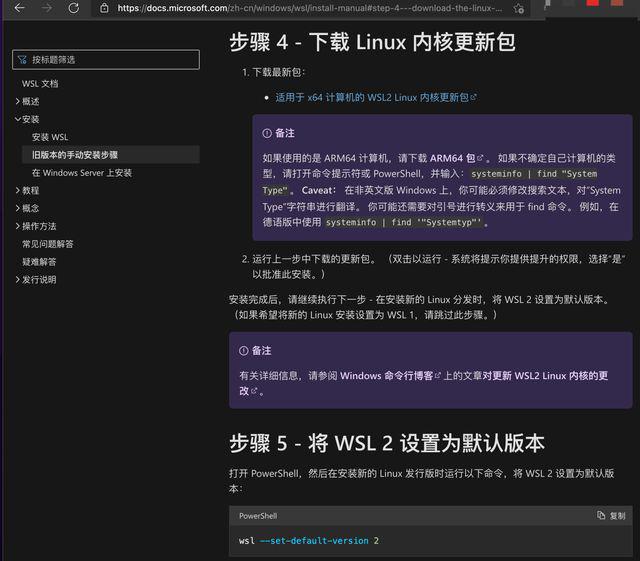 这里我们需要到微软的网站下载“WSL2 Linux内核更新包 for x64 computers”并在安装后在PowerShell中设置WSL2为默认版本。
