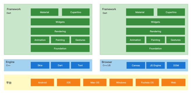 Google在2018年发布了Flutter 1.0,如图2所示,主要分为Framework层和Engine层;