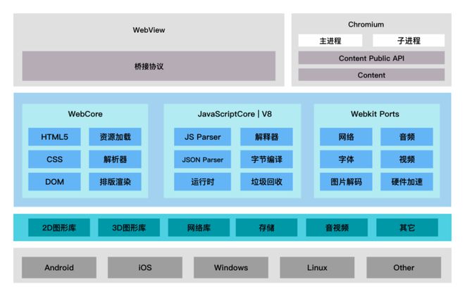 WebCore是浏览器加载和卸载渲染页面的基础,主要包括资源加载、HTML分析、CSS分析、DOM分析、布局渲染等。JavaScript引擎是一个JavaScript分析器,JavaScriptCore是一个WebkitJavaScript引擎,V8是谷歌默认的Blink引擎;WebKit Ports是WebKit的端口部分,它包括网络、字体、图片解码、音频视频解码、硬件加速等模块,还有许多第三方图书馆,包括2D图形库、3D图形库、网络库、存储库、音频和视频库等。它支持Android、iOS和Windows。