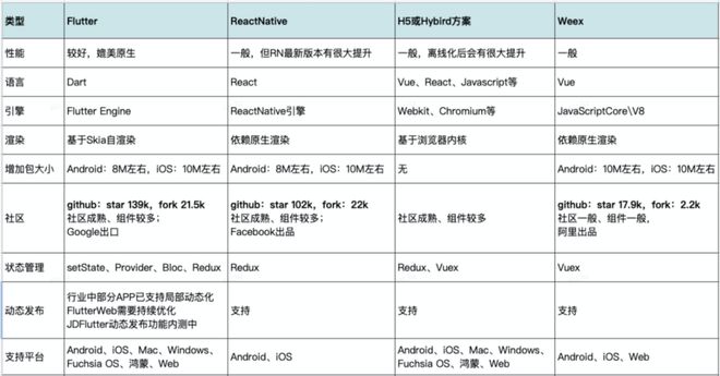 与此同时,一些跨部门的技术解决方案已经出现,一套代码可以在多个端上实现,解决商业发展瓶颈例如,Flutter、ReactNative、Weex和H5(注:小程序和其他基于DSL的程序目前没有讨论)。然后我们分析了一些常见应用软件,结论和预期一致,其中大多数使用跨国技术;Flutter和ReactNative的使用率较高,威克斯的使用率相对较低,H5基本都在使用,采用各种跨部门的技术框架是规范的。那么,它们的特征是什么?