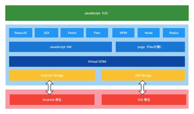 ReactNative於2015年在Facebook上推出。如图3所示,主要服务于Android和iOS,使用React开发实现逻辑侧码(同样适用于前端),使用Redux实现国家管理,在APP中,用户界面渲染、网络请求、动画等都是由原来的侧桥实现的,这里是实际运行的过程,死亡的js侧构成一个虚拟死亡,通过桥桥将异族结构转移到原来的侧面,将分析和映射到原始控制器,形成原型结构之后,取消显示的原始功能。