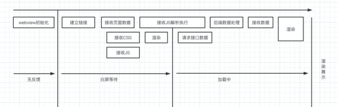 图7描述了整个过程,从WebView初始化到H5页最后渲染,并用以前的H5对基本渲染过程进行分析。时间消耗的联系有两个主要问题,一个是WebView的初始化,您可以通过预先启动WebView来优化这个问题;其次,请求连接和资源(html、js、csspicture等)的加载,这个问题可以通过H5分离方案解决,通过资源的预加载,解决html 、 js 、 css和资源图像加载问题,这大大降低了资源的装载时间,提升页面加载性能,甚至达到第二开的效果。