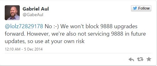 但微软Windows Insider内测计划负责人Gabriel Aul在其Twitter表示,Win10预览版9888“并没有准备好给Win10内测成员(使用)”。尽管如此,“我们以后不会阻止Win10预览版9888升级到新版本。然而我们也不会再给这一版本提供更新补丁,所以(安装这一版本的用户需要)自担风险”。由于这个版本不是官方公开发布的Win10预览版系统,所以微软不会对这一版本进行任何修复。