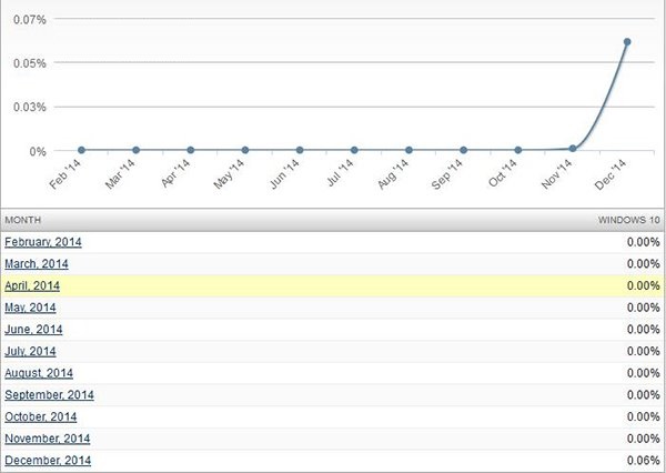 但是Net Applications填补了这一消息空白。截至2014年12月,Windows10目前的占有率为0.06%。而根据微软公布的使用情况,目前Win10有超过150万用户参与了Win10内测计划。作为一款测试版的系统,Win10这一成绩还是可圈可点的。