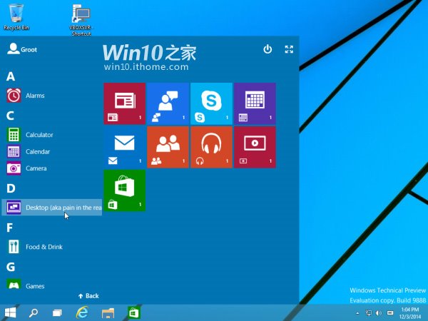 ▲ Win10预览版9888平板电脑中的Continuum模式开始屏幕/菜单