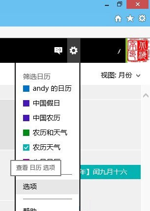第一步、使用微软账号登陆微软日历网页,点击左上部粗轮状按钮,下拉菜单中选择“选项”。