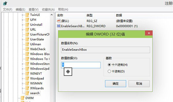 3、创建一个新的DWORD值,命名EnableSearchBox并且设置键值为1。如果目前存在这个键值,将其值由0改为1。