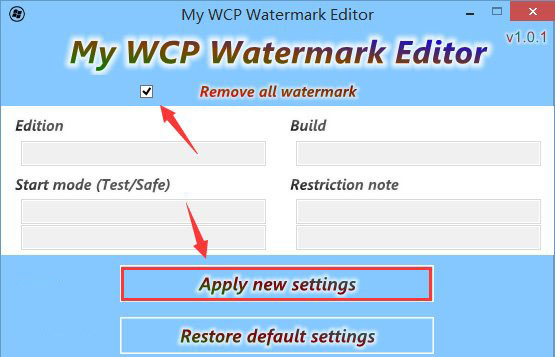 打开工具后,勾选“Remove all watermark”,然后点击下方的“Apply new settings”即可,如下图所示。去水印过程中资管管理器会重启一次,需要一点时间才能完成,请耐心等待。