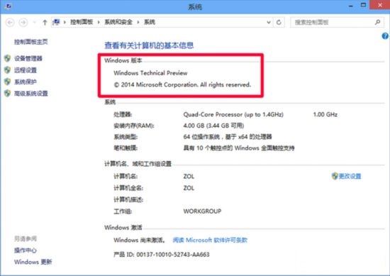 系统安装设定好之后,就会直接进入Windows 10预览版系统。通过系统属性我们看到,本次系统版本的名称并没有“Windows 10”的字样,而是 采用了“Windows Tecnical Preview”,技术预览版,安装之后系统未激活的话,可以用微软官网提供的密钥来激活系统,这样就可以正常使用本次预览版的所有功能了。本次的系统名称为Windows Technical Preview