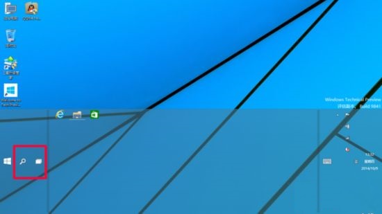 本次预览版还有一个小变化是下图左下角红框标出的两个图标,左侧放大镜样式的图标是搜索菜单按钮,右侧两个迭加小方块儿图标是Task View图标,这个图标可以让用户实现多桌面的添加。