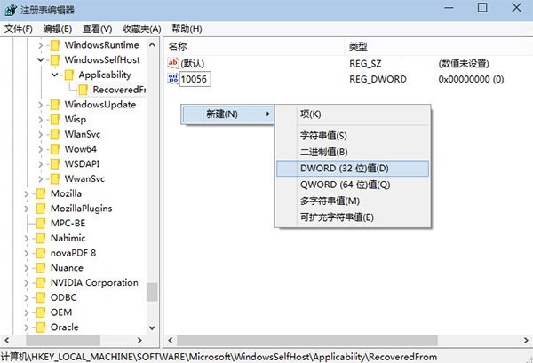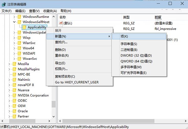 2、找到 HKEY_LOCAL_MACHINE\SOFTWARE\Microsoft\WindowsSelfHost\Applicability\RecoveredFrom(若没有RecoveredFrom项,在Applicability上点击右键,选择新建“项(K)”)