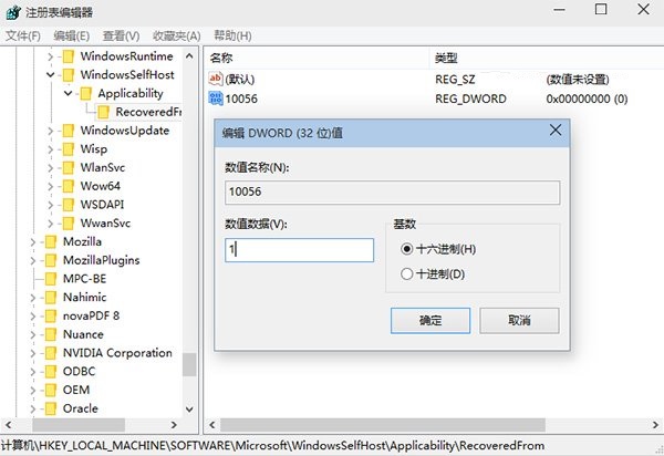 4、将该DWORD值重命名为想要“屏蔽”的版本号,将数值数据改为“1”后确定