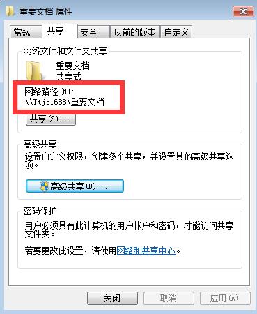 5、在回到重要文档属性之后可以看到了\\说明共享成功了。
