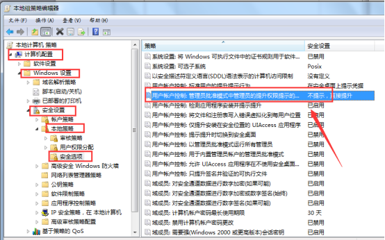 1、点击使用快捷键“win+R”打开运行窗口,在搜索框中键入“gpedit.msc”命令,打开“本地组策略编辑器”,在该页面左侧找到“计算机配置”--“windows设置”---“安全设置”--“本地策略”--“安全选项”,鼠标点击安全选项,在右边窗口的设置中找到“用户账户控制:管理员批准模式中管理员的提升权限提示”,如图示。