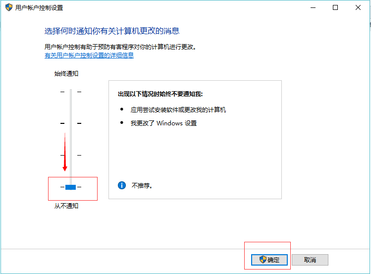 2、点击“启动”按钮后,进入“用户账户设置”页面将图中箭头所指的通知,下拉到“从不通知”,如图所示。最后点击将电脑重新启动即可。
