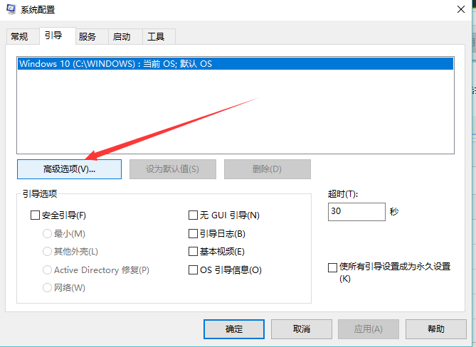 3、点开上方的引导那块的菜单;进入引导界面后,我们可以看到当前自己电脑的系统,当然如果是双系统就可以看到两个,在这里选择“高级选项”。