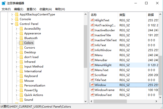 2、依次打开:HKEY_CURRENT_USER\Control Panel\Colors,在右侧找到并打开Windows选项,如图所示: