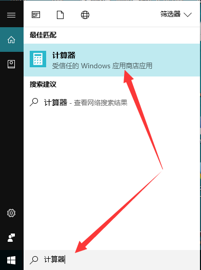 1、点击开始,搜索,”计算器“ ,并打开。