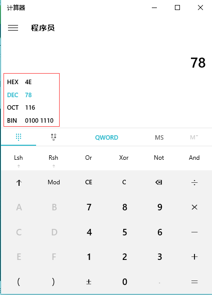 4、点击计算器上面的数字输入一个数字,这里输入78,我们就会看到十六进制是4E,八进制是116,二进制是0100 1110。