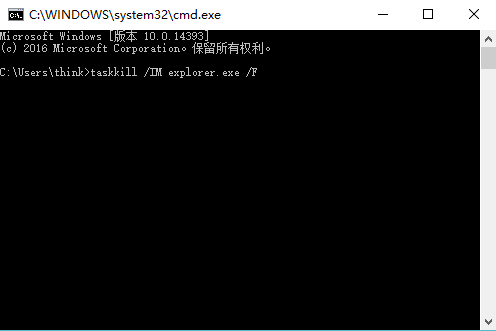 3、输入taskkill /IM explorer.exe /F回车将桌面关闭。